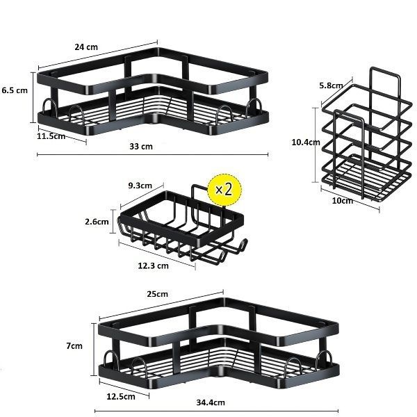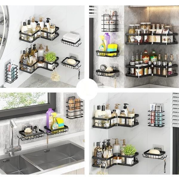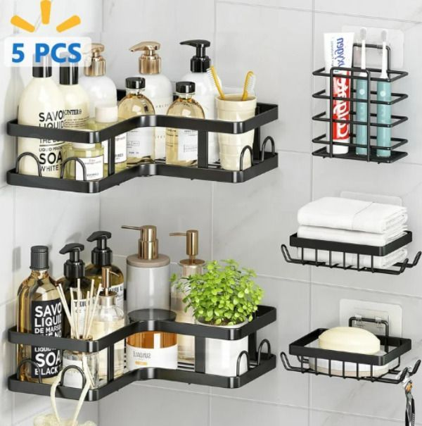 Σετ επιτοίχια ράφια οργάνωσης μπάνιου, με 2 γωνιακά ράφια, 2 θήκες σαπουνιού/σφουγγαριού και 1 θήκη για οδοντόβουρτσες.