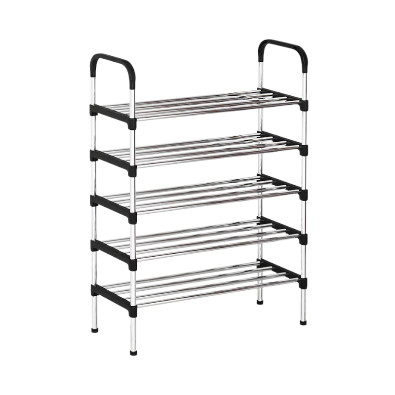 Ραφιέρα παπουτσιών 5 επιπέδων, με μεταλλικές βέργες και εύκολη συναρμολόγηση. Διαθέτει αντιολισθητικά πατάκια για την προστασία του πατώματός σας. Ιδανική για έπιπλο εισόδου ή οργάνωση αποθήκης. Διαστάσεις: 105 x 56 x 26cm